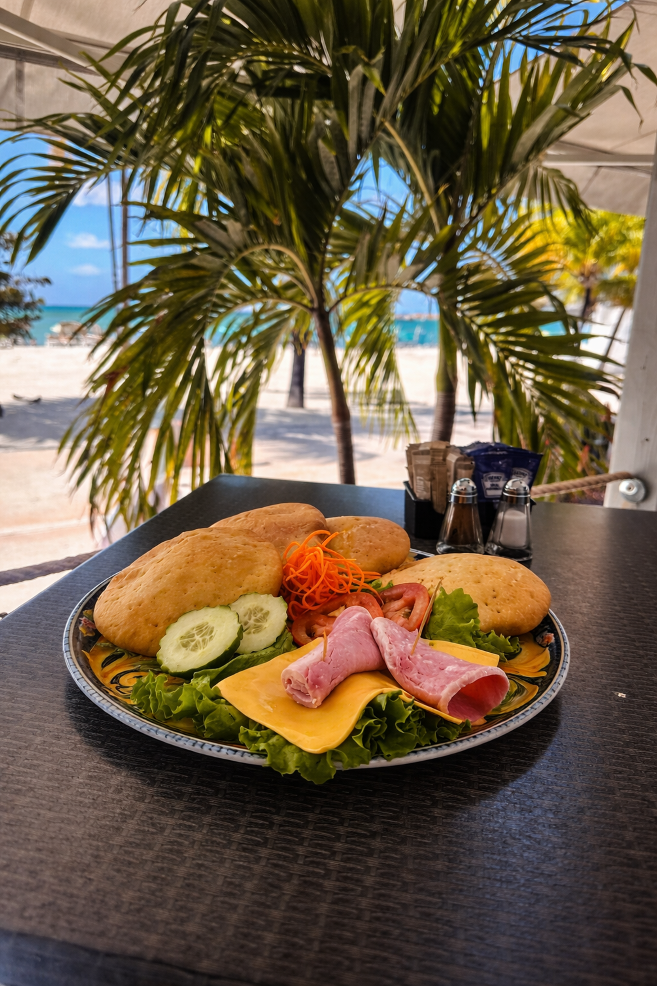 Fry Johnny Cake Served with Ham American Cheese Avocado and side Salad.
